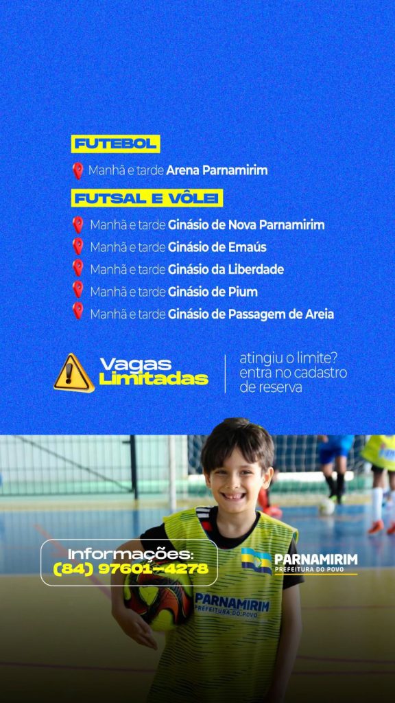 Estão abertas até o dia 26 de fevereiro as inscrições para o EMEP (Esporte, Movimento e Oportunidade em Parnamirim), promovido pela Secretaria de Esporte e Lazer. As aulas são gratuitas e destinadas a crianças e adolescentes de 7 a 17 anos.
